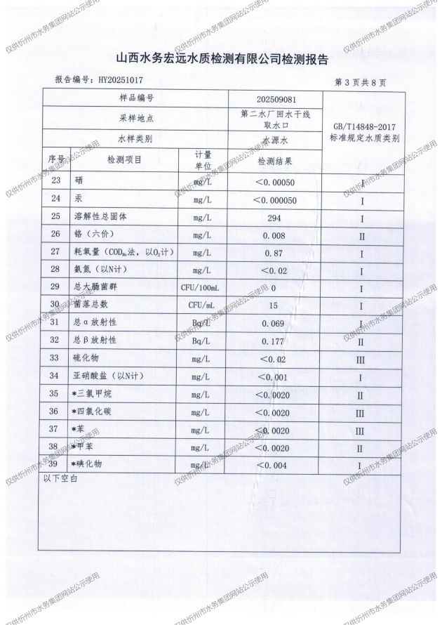 忻州城區(qū)公共供水水源水、出廠水、管網(wǎng)水、管網(wǎng)末梢水2025年9月份水質(zhì)信息公示