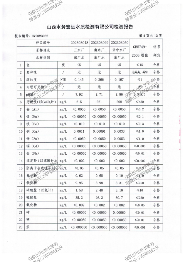 忻州城區(qū)公共供水水源水、出廠水、管網(wǎng)水、管網(wǎng)末梢水2023年3月份水質信息公示